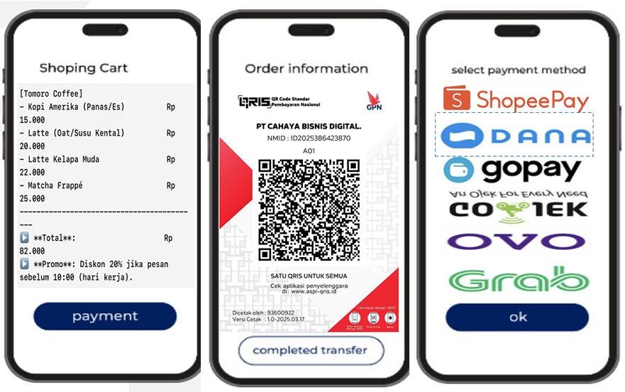 线上支付则简化操作流程,消费者保存 QRIS 二维码,通过钱包 APP 扫码即可完成支付,支持 Shopee Pay、DANA 等多种支付方式,购物体验无缝衔接。