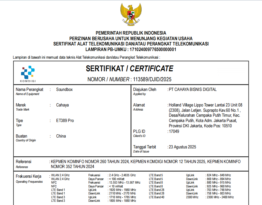 Selamat untuk Speaker Pembayaran ET389 Pro milik CAHAYA telah berhasil memperoleh Izin Operasional Perangkat Telekomunikasi yang diberikan oleh Kementerian Komunikasi dan Informatika Republik Indonesia (KOMINFO) dengan Nomor Sertifikat: 115990/DJID/2025!
